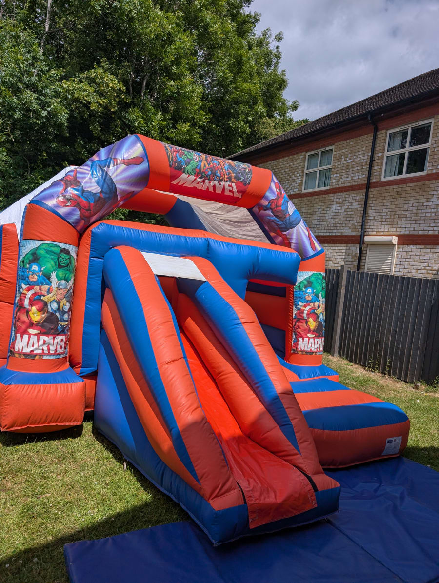 🏡 We proudly provide Marvel Colourful Castle with Slide Hire across Bristol, Chepstow, and Newport – bringing superhero fun to your event!